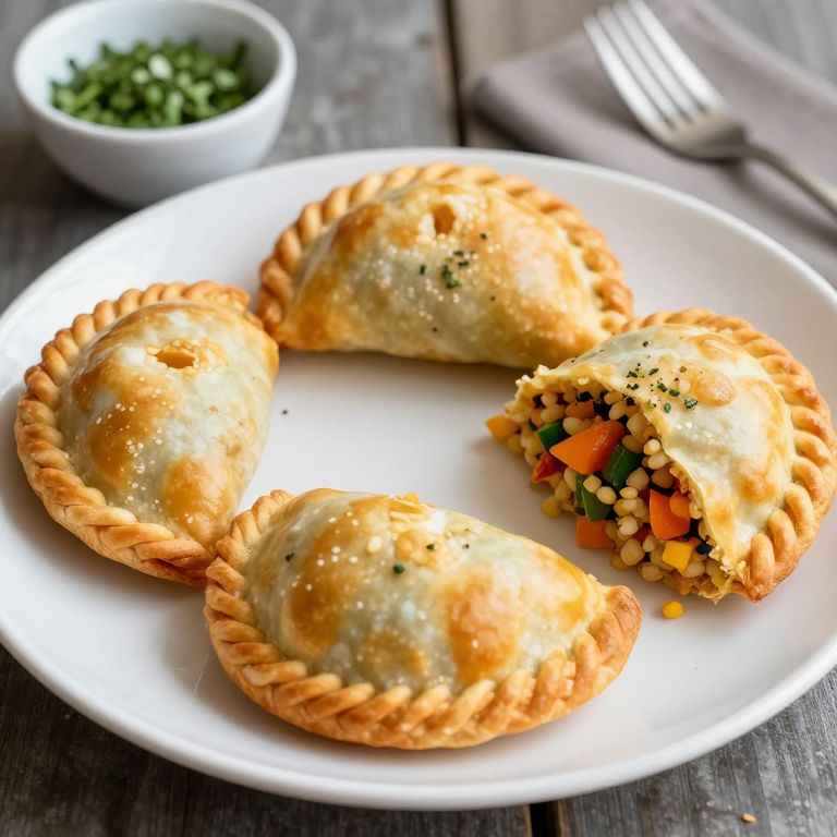 Golden empanadas from Beat Kitchen, neatly arranged on a white plate, showcase a flaky exterior and a colorful filling of vegetables and grains, accompanied by a small bowl of fresh herbs in the background.