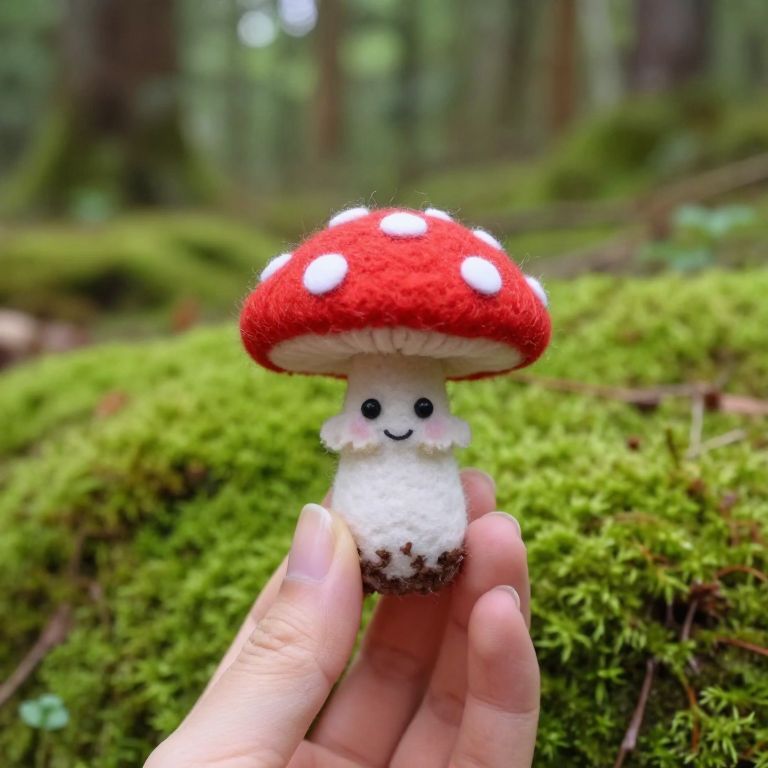 A charming and tiny felted mushroom with eyes and a smiling face is held delicately in a hand, set against a backdrop of lush green moss and trees. The mushroom, with its vibrant red cap adorned with white spots and a cheerful expression, stands out against the verdant forest floor. The hand, with its neatly manicured nails, gently cradles the mushroom, creating a sense of scale and intimacy. The background, a blend of moss-covered ground and trees, adds a natural and serene atmosphere to the scene, highlighting the delicate craftsmanship of the felted mushroom. The overall composition is balanced, with the mushroom centrally positioned, drawing the viewer's attention to its adorable features and the intricate details of its texture.