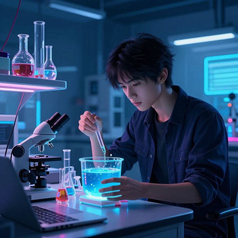 Photograph of an Asian man with short, dark hair, wearing a black button-up shirt, intently mixing a glowing blue liquid in a glass beaker using a pipette in a brightly lit, futuristic laboratory. Neon blue and pink lights illuminate the room, casting a cool, digital ambiance. To his left, a microscope and various glass flasks and bottles with colorful liquids are neatly arranged on a white table. The background features blurred, metallic lab equipment and a computer screen with glowing blue text. The image has a sci-fi, high-tech feel.