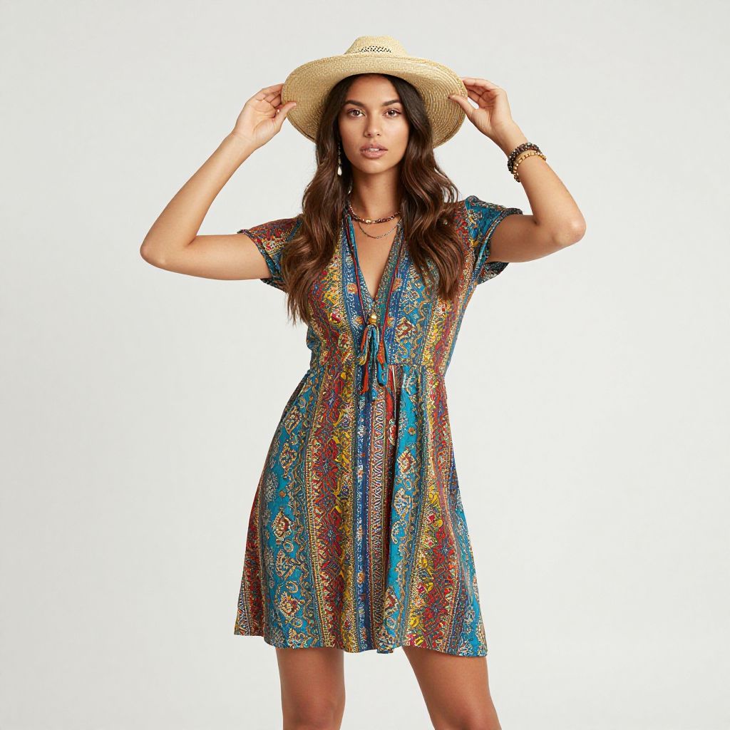 "Woman Hippie Costume, woman wearing a hat and a colorful dress posing for a picture"