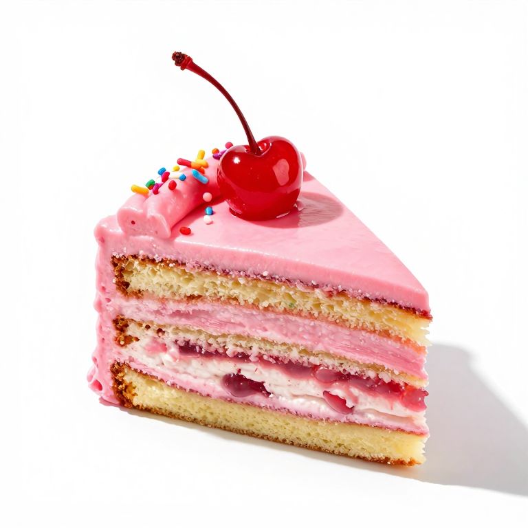 Delicious slice of layered cake topped with vibrant pink frosting, colorful sprinkles, and a glossy red cherry, casting a soft shadow on a pristine white background.
