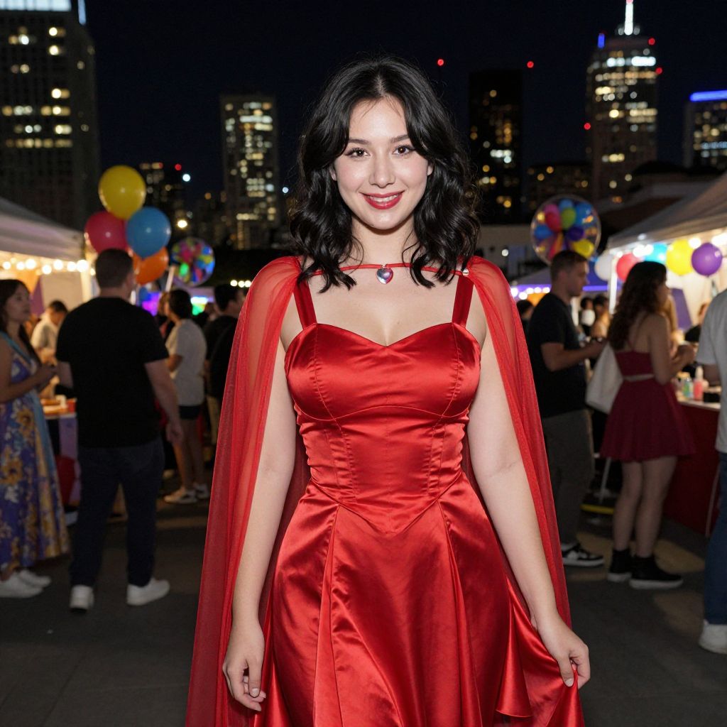 A woman in her late twenties with wavy black hair and a kind, radiant face stands in a bustling costume party at a rooftop city festival, wearing a red satin dress with a fitted bodice and a flowing hem. The dress is a modern take on a classic costume, paired with a sheer red cape. The city lights shine behind her, and there are colorful balloons and fans in the background, creating a vibrant festive mood.. The woman has big tits and cute face