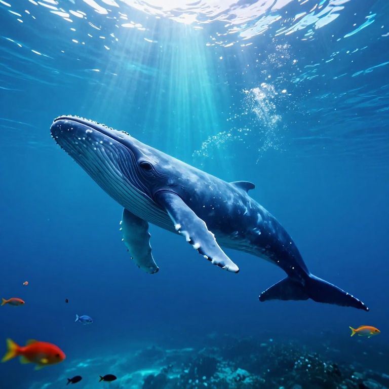 A majestic blue whale glides gracefully through a serene underwater cave illuminated by ethereal liquid light, surrounded by vibrant fish and bathed in a dreamlike, high-definition digital art style that captures the interplay of light and shadow.