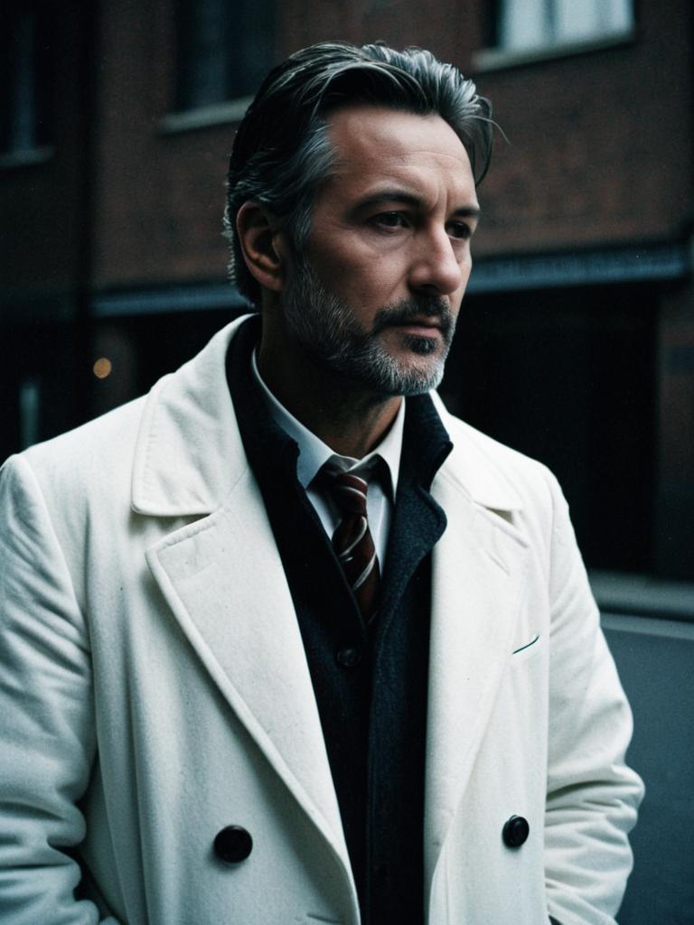 Man in White Coat, cinematic realism, professional editorial shot