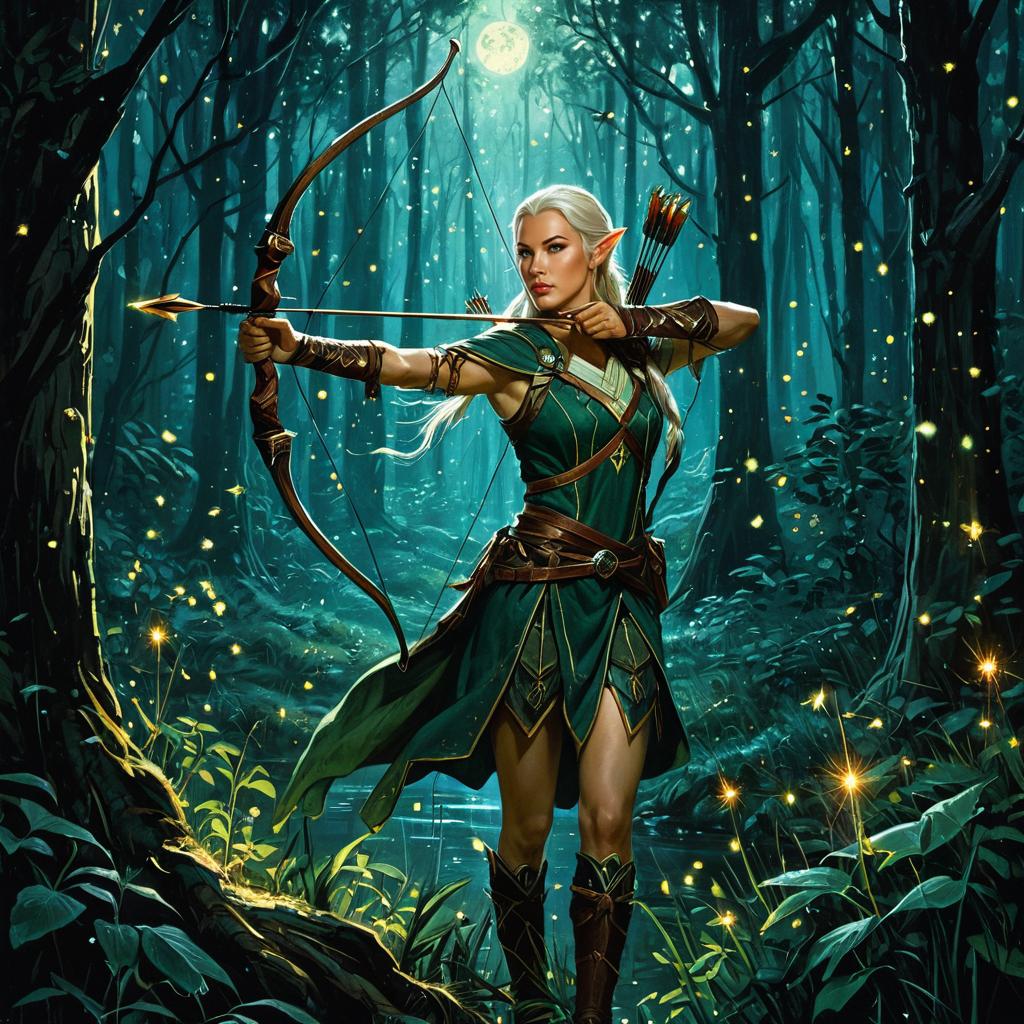 Full-body fantasy portrait of elven archer scout with glowing green eyes, silent and poised in mystical forest bathed in moonlight with sparkling fireflies, digital painting by J.C. Leyendecker, Alice X. Zhang, Greg Rutkowski, detailed, smooth, sharp focus.