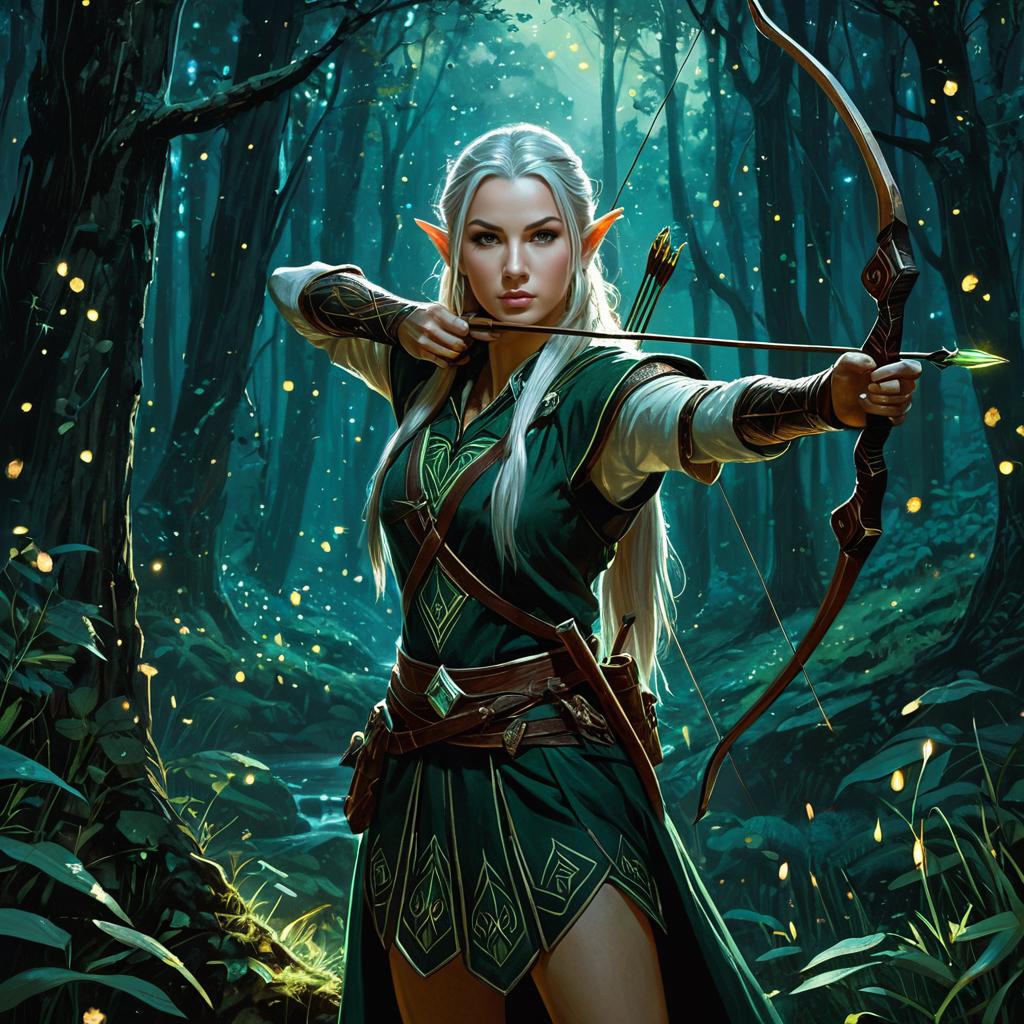 Full-body digital portrait of a female elven archer poised with a bow and arrow in a moonlit enchanted forest. She has pointed elf ears, glowing green eyes, and wears an intricate green outfit with detailed embroidery and leather accessories. Surrounding her are sparkling fireflies and tall trees under a bright full moon, creating a mystical, serene atmosphere.