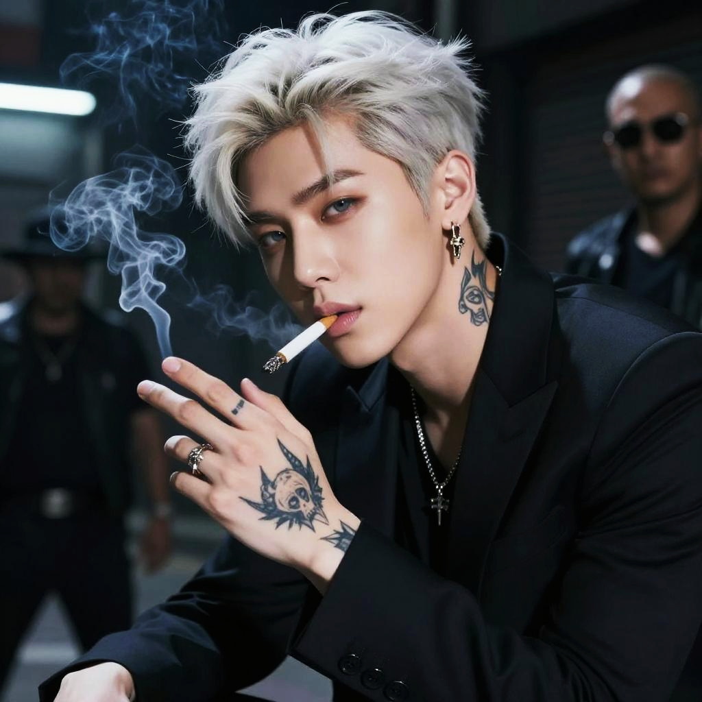 (8k photo, best quality, masterpiece:1.2), (realistic, photo-realistic:1.37) young, handsome man, Mark Tuan, Got7, white skin, detail face, grey bright eye, white hair, black suit, bad boy, yakuza, tattoo, smoke cigarrate, a lots gangster night town in backdrop, action pose, skull earring, necklage