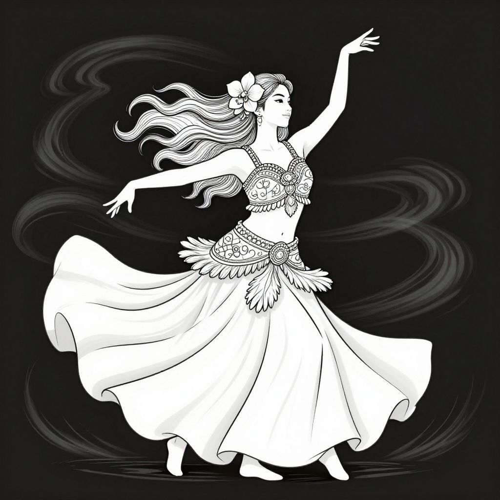 Detailed line art of a poised hula dancer with long, wavy hair adorned with orchids. The dancer wears a flowing skirt and intricately patterned top, captured in fluid movement against a dark background with swirling gusts accentuating her graceful silhouette.
