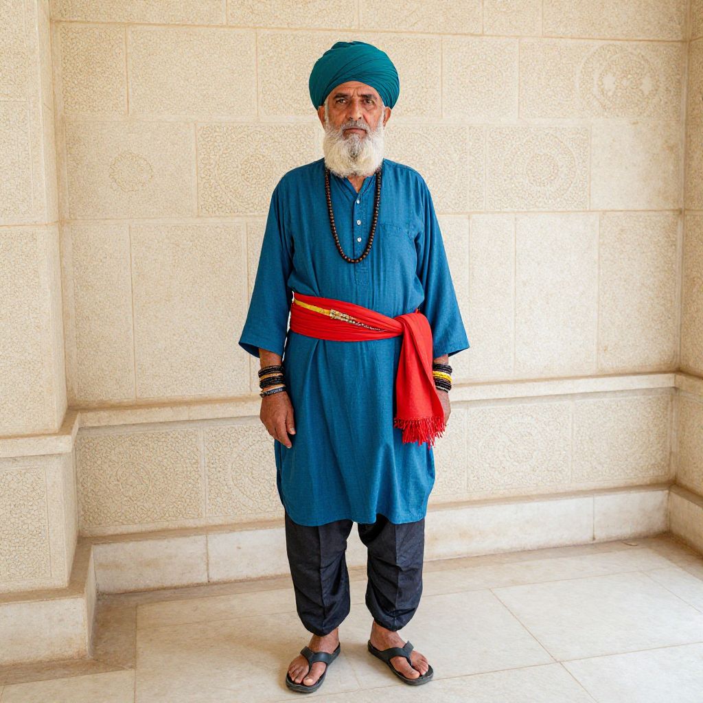 Photograph of an elderly South Asian man with a white beard and mustache, wearing a teal turban and matching loose-fitting tunic with black pants. A red sash is tied around his waist, and he has numerous colorful bangles on his right wrist. He is adorned with a black bead necklace. He stands against a light beige stone wall with a tiled floor, wearing black sandals. The lighting is bright and even, highlighting the textures of his clothing and the wall. The man looks directly at the camera with a calm expression.