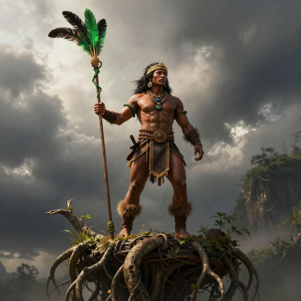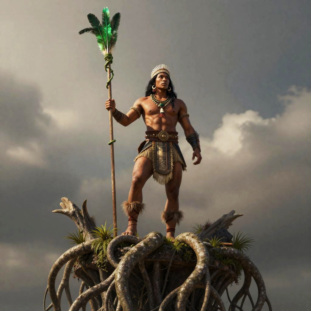 A Amazonian huntress stands confidently atop a canopy citadel of living roots, with a emerald feather standard woven with vines billowing behind him. This ferocious figure embodies strength in a dramatic fantasy setting, showcasing intricate details and merging modern digital artistry with classic influences.