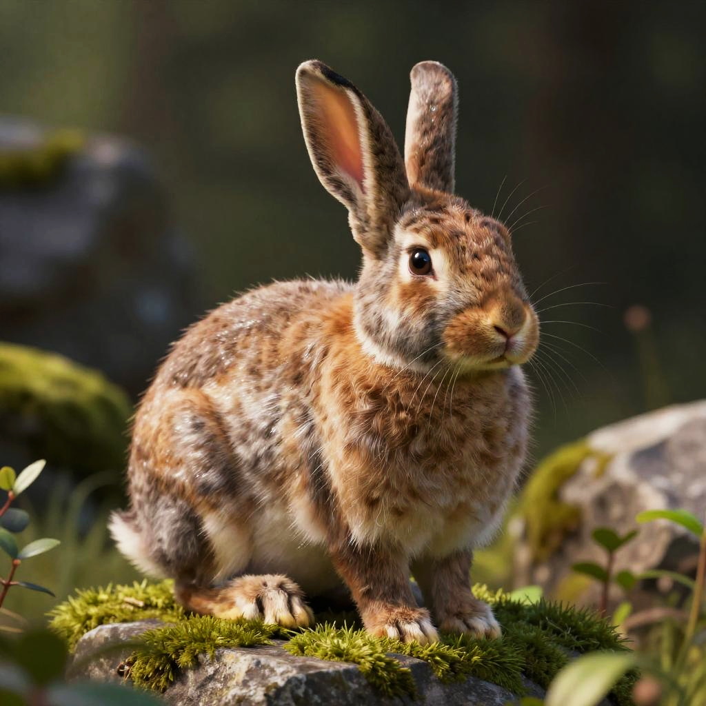 Rabbit 3d view captured in hyper-realistic style, fur glistening in the sunlight, sitting on a moss-covered rock with intricate detail in the surrounding foliage