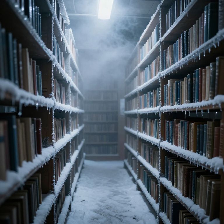 Snow-covered shelves line an endless aisle in a frosty library, their icy surfaces reflecting the dim light as a mysterious fog swirls above, hinting at whispers of forgotten knowledge.