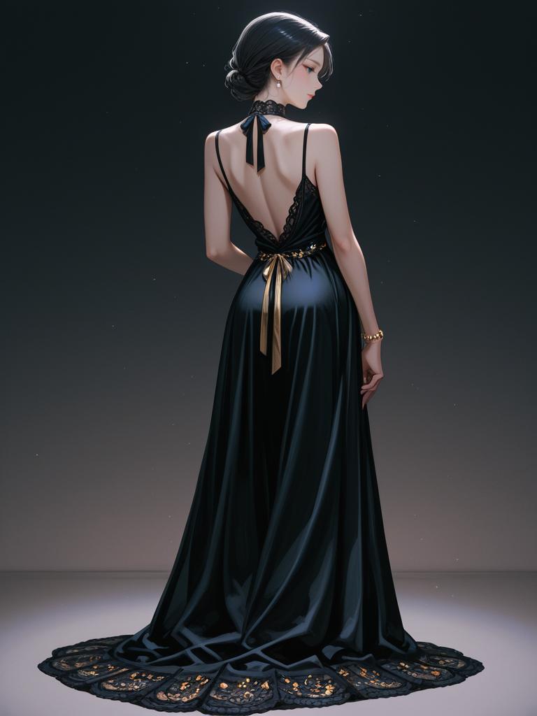 Full body portrait of an elegant woman wearing a black sleeveless backless evening gown with lace detailing and a gold ribbon belt. The fitted dress features a high neckline and a flowing skirt with a scalloped hemline. She has her hair styled in a neat updo and wears small stud earrings and a delicate gold bracelet. The background is dark and minimalistic, emphasizing the sophisticated attire.