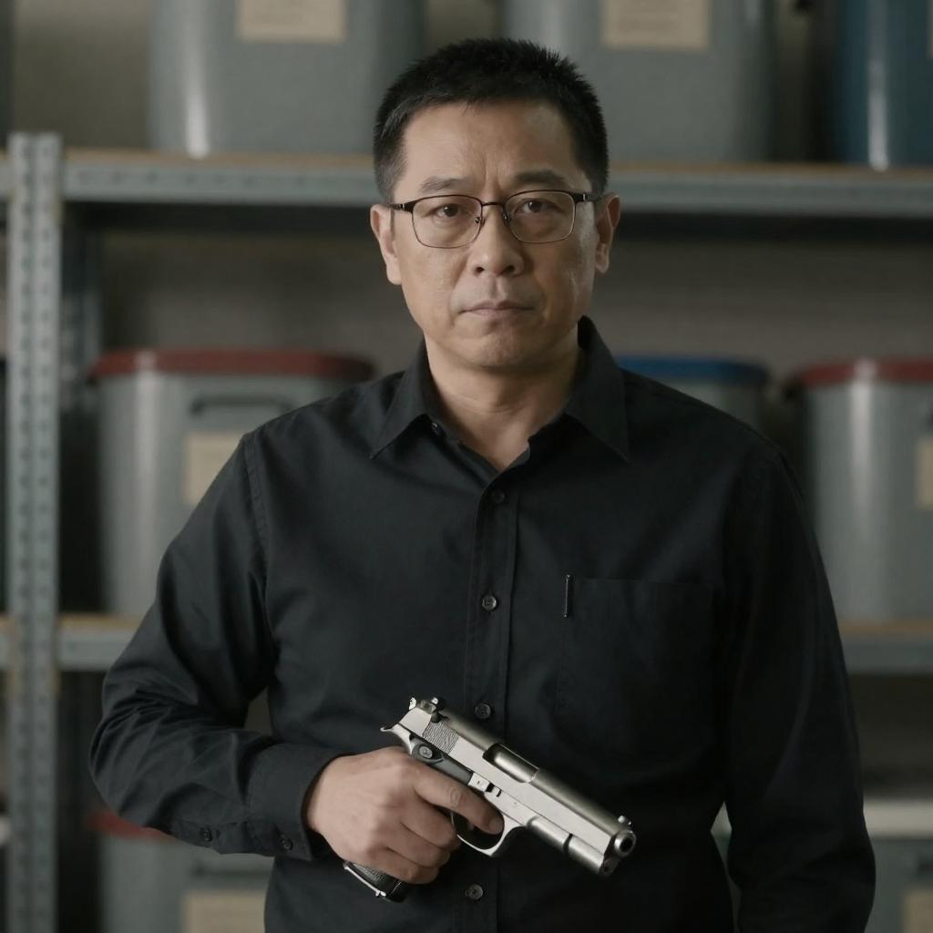 Two men in an industrial control room environment; one tall bald man wearing a white shirt and camouflage pants is pointing a black handgun at a seated man with glasses wearing a grey T-shirt. The background includes industrial control panels with screens and red buttons, indicating a factory or production facility setting.