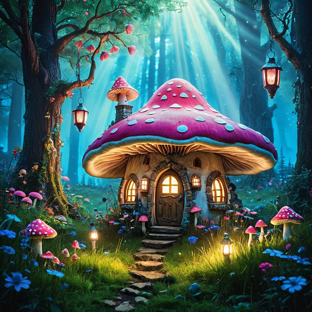 A whimsical fantasy scene of a magical mushroom house with large pink mushroom caps, glowing lanterns hanging from trees, lush green grass and colorful flowers surrounding the house, soft glowing light rays filtering through a misty blue and pink sky, dreamy atmosphere, enchanting forest setting, magical mood