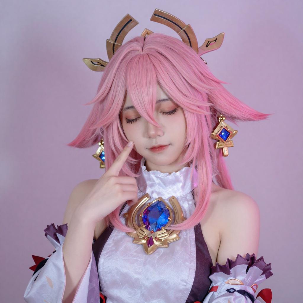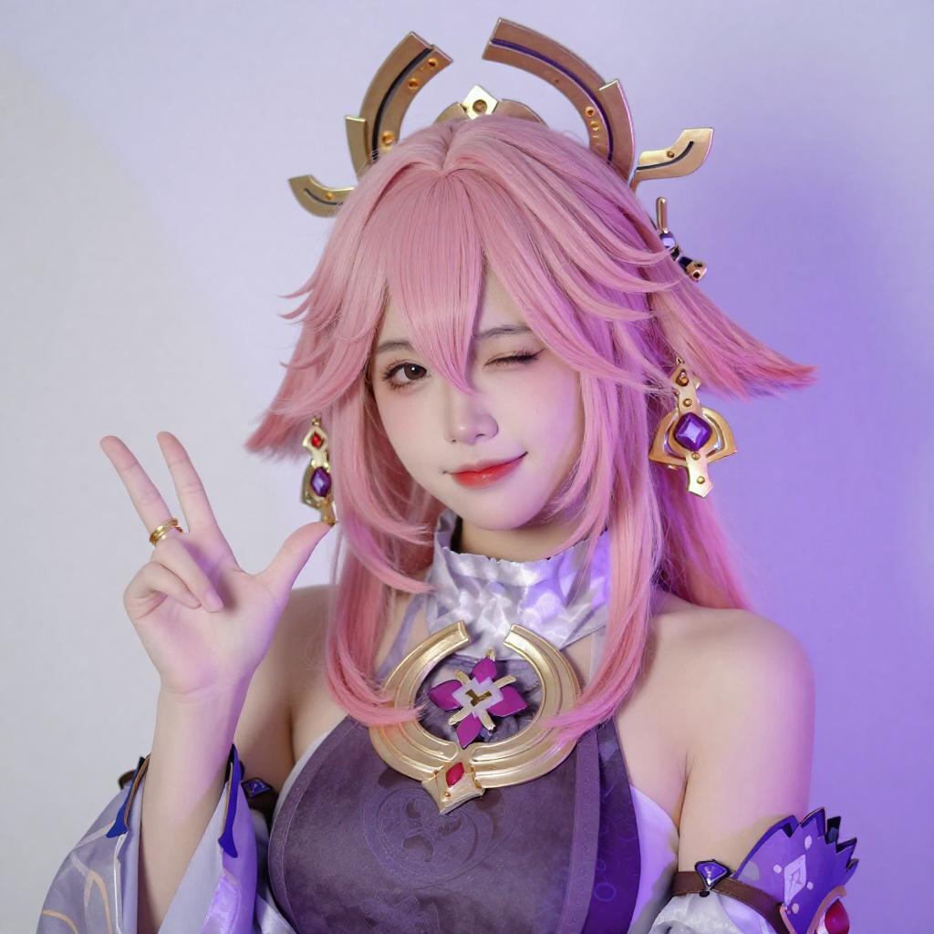 Photograph of an Asian woman with long pink hair, wearing a gold crown with heart-shaped pink horns, and a purple and gold costume with white frills. She has red lipstick and is posing with one hand near her face, against a softly lit background with purple and pink hues.