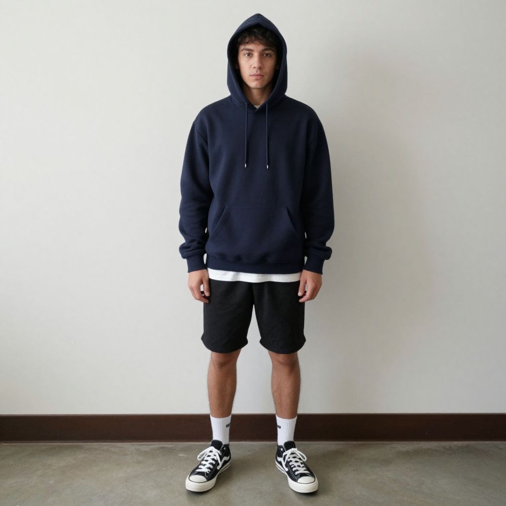 "funny random costume, solo, 1boy, male focus, hood, shoes, shorts, sneakers, hood up, standing, full body, hoodie, socks, blurry Realistic photo of casual sexy person with pretty face"