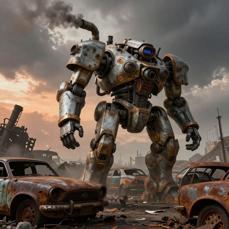 Cyberpunk-style, CGI-rendered, rusty mecha robot towering over a post-apocalyptic junkyard with rusted cars, dark clouds, and