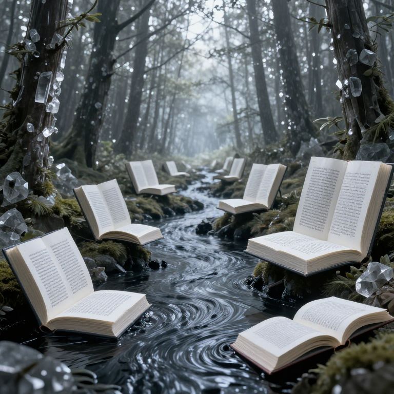 A forest of crystalline books grows vertically from a river of ink, each volume changing stories as it floats.