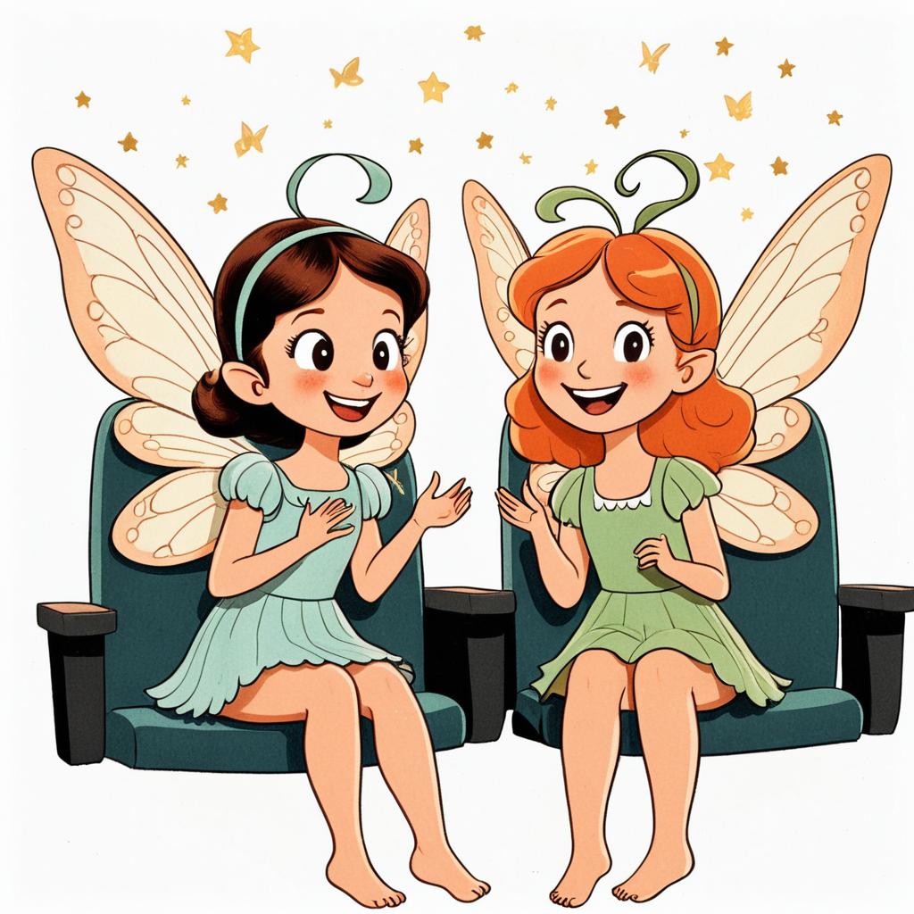 Artstation Beatrix Potter, white background, cute illustration, 2 delightful fireflies, one with golden glow, the other one with soft amber glow, both have pretty wings, both fairies laughing, both sitting in movie theater seats while watching a movie, both fairies clapping, David Wiesner style, v5, white background