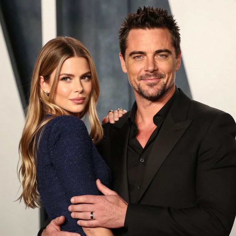 Photograph of a smiling couple standing close together against a blurred white and dark blue background. The woman, with long, wavy blonde hair, wears a dark blue, textured sweater and looks over her shoulder at the camera. The man, with short, spiked dark hair and a light beard, wears a black blazer over a black shirt. He has his right arm around her waist, with his left hand resting on her upper back, displaying a black ring. The lighting is bright, emphasizing their faces and creating a slight shadow behind them.