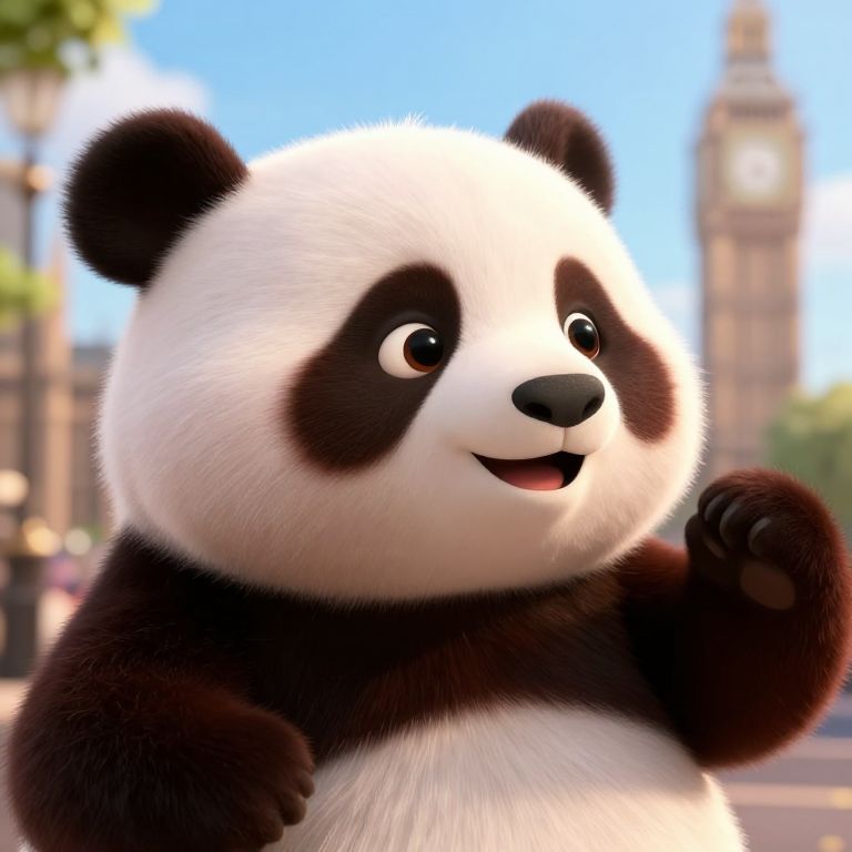 Cute CGI panda with black and white fur, wearing a blue baseball cap with a "B" and blue denim shorts, standing against a gradient gray