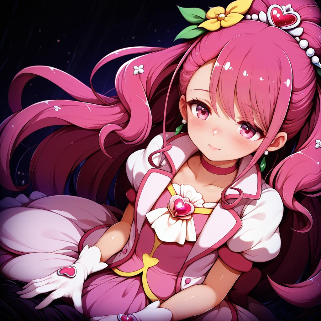 Close-up illustration of a magical girl character with very long pink hair adorned with a heart-shaped hair ornament and yellow flower. She has pink eyes, wears white gloves, a pink dress with a choker, puffy short sleeves, and pearl earrings. The image is vibrant with a dark background, highlighting the character's detailed and stylized anime design.