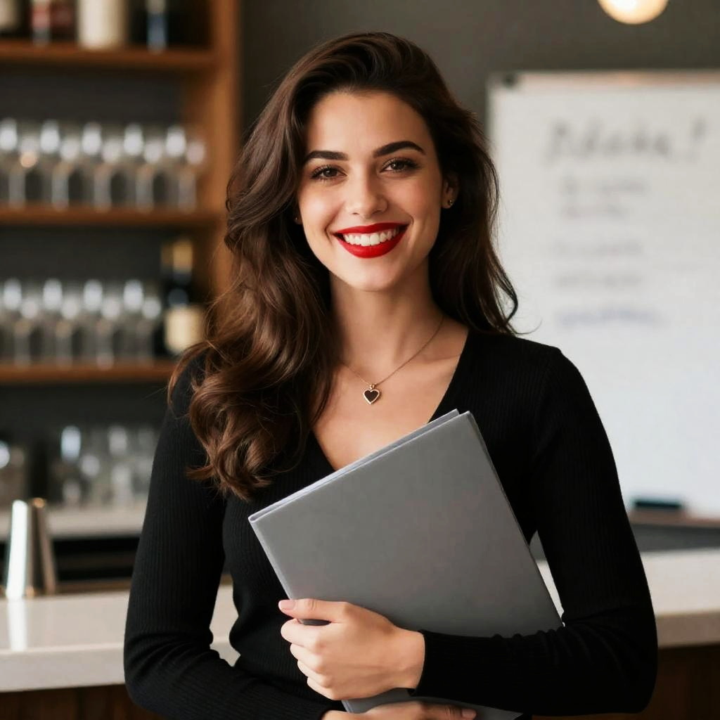 Woman with long brown hair, gray coat, red top, smiling, holding pencil, writing on paper, coffee cup on table, Christmas decorations in background, bokeh lights, outdoor setting, sitting at table.