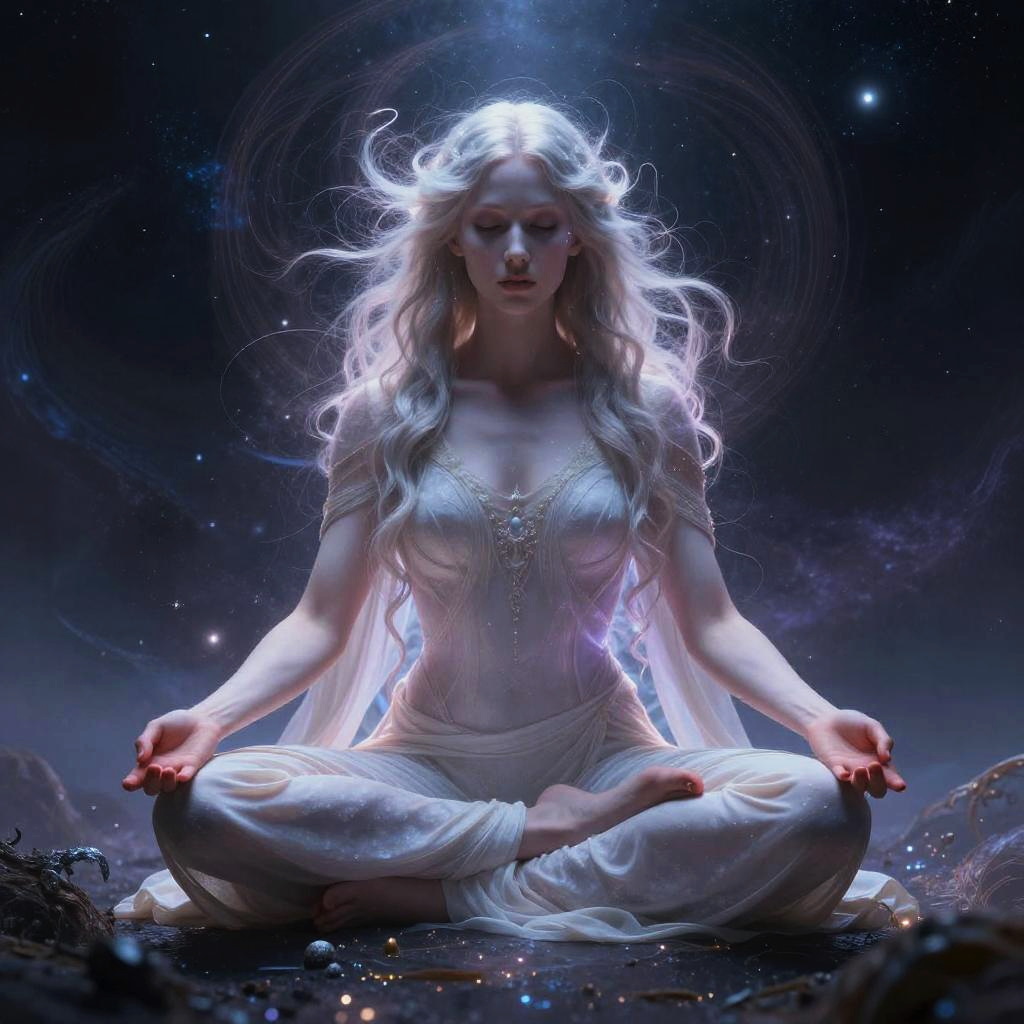 Digital artwork of a serene, blonde, ethereal woman in a white, flowing dress, meditating in a cosmic space, with glowing jewelry and a
