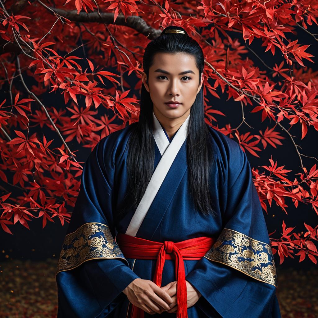 Portrait of an Asian man wearing a traditional Korean hanbok consisting of a dark navy robe adorned with ornate gold patterns on the sleeves, complemented by a red sash. He has long black hair styled traditionally and stands against a backdrop of vivid red autumn leaves. The image is captured with soft, realistic lighting in a studio setting, highlighting detailed clothing textures and symmetrical composition.