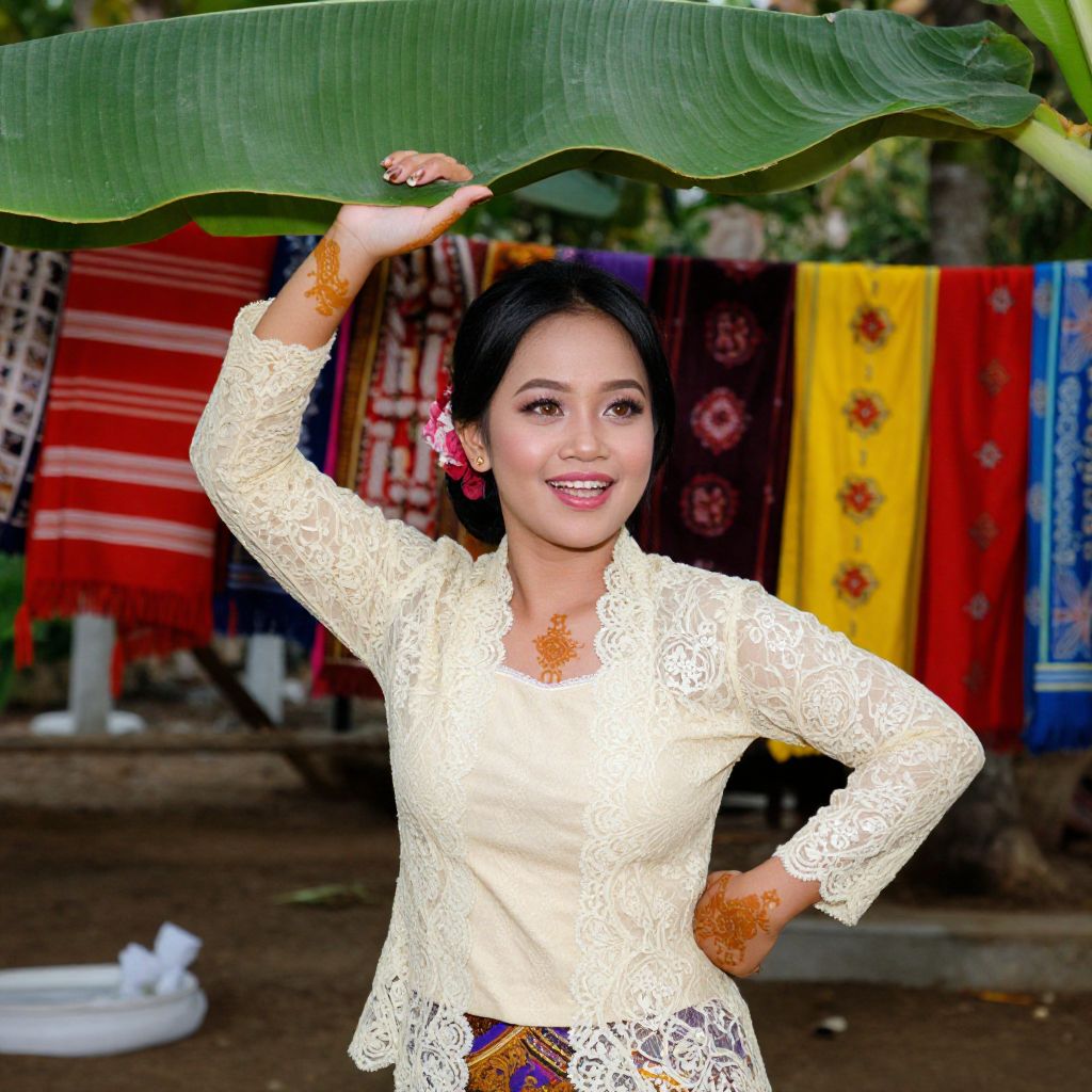 A graceful Malaysian woman in a festive kebaya and lace blouse, dancing under a canopy of banana leaves in a rural celebration, her face glowing with joyful expression, warm brown eyes, full lips, traditional makeup with subtle henna, surrounded by vibrant red, yellow, and blue textiles, natural outdoor setting, authentic cultural portrayal. The woman has big tits and cute face
