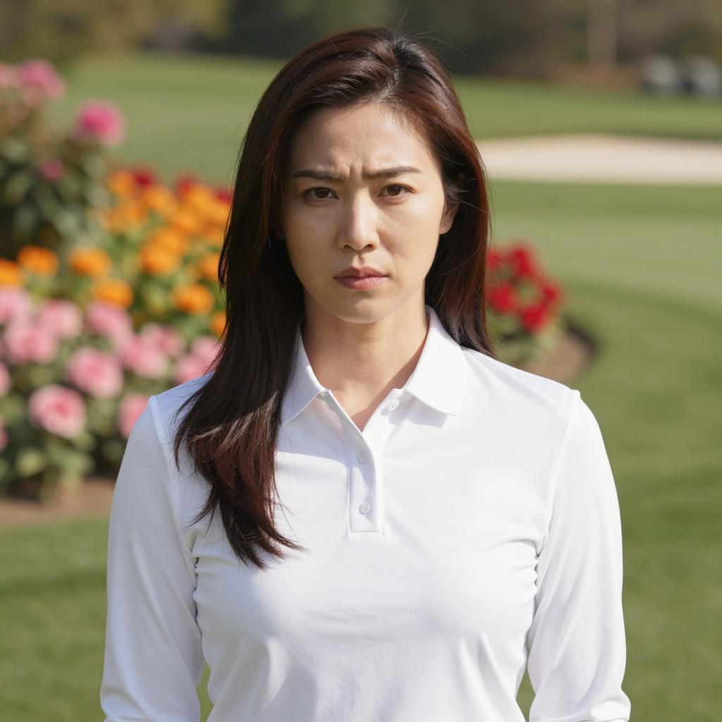 Portrait of a serious Asian woman with brown hair styled in a bun, wearing a red and white dress with a belt. She is standing outdoors in an urban setting with blurred greenery and buildings in the background. The image features soft natural lighting and a modern casual style.