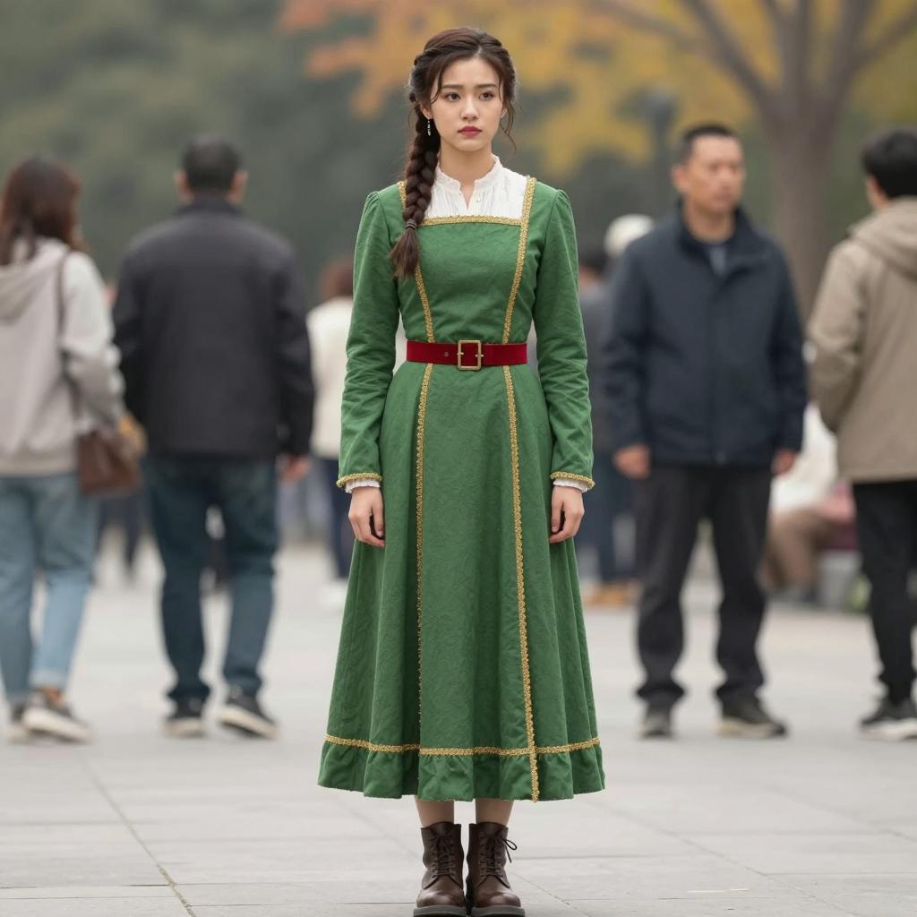 Work woman clothing costume, photo of Asian woman, red and white dress, brown hair in bun, serious expression, daytime, urban background, green plants, blurred buildings, realistic, modern, casual, soft lighting, natural colors, standing, looking to the side, detailed ures, clear focus on subject, slightly blurred background, subtle shadows, realistic style
