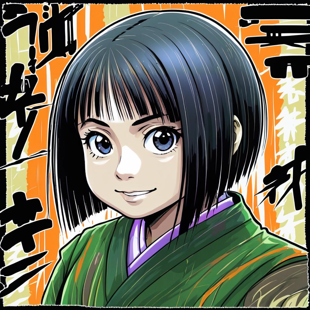 Digital illustration of an anime-style girl with short black hair and large blue eyes, wearing a green kimono with a purple collar. The background features bold orange and cream stripes with stylized Asian calligraphy elements, evoking a traditional Japanese aesthetic.