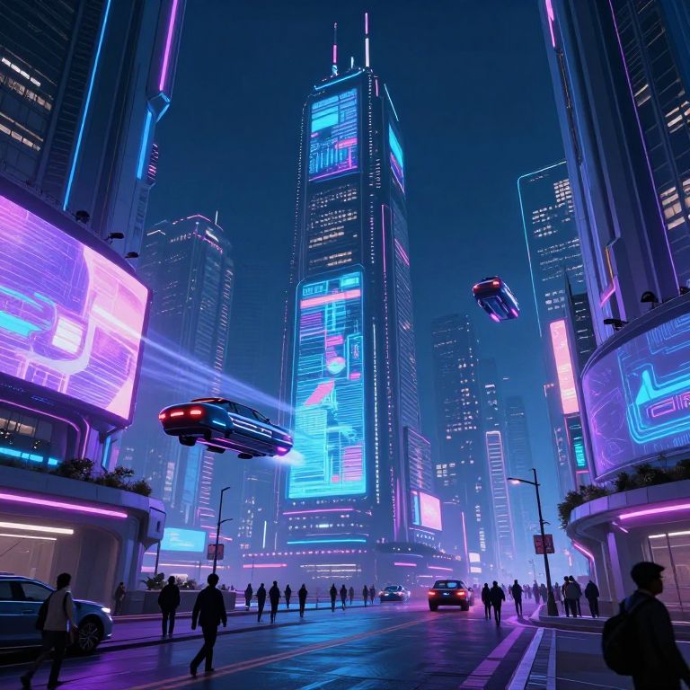 Effvta depicted as a futuristic city with towering neon skyscrapers, holographic billboards, flying vehicles zooming through a high-tech urban environment, bustling streets with diverse inhabitants, cyberpunk aesthetic with deep blues and purples