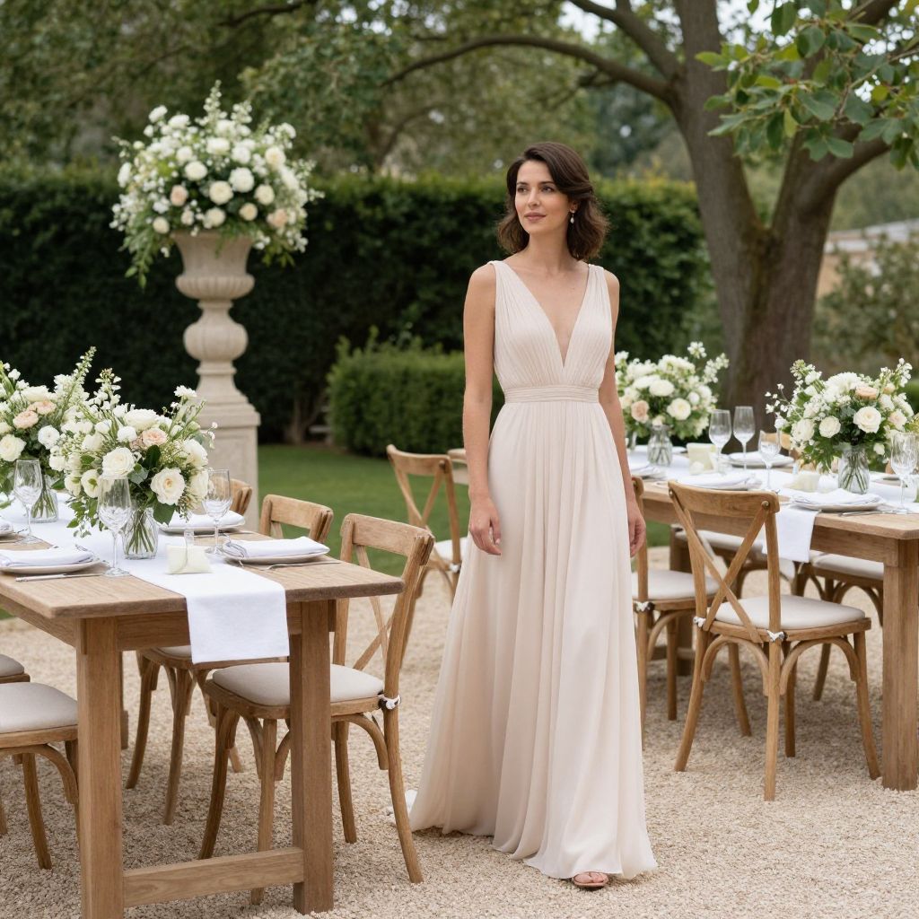 Photograph of a beautiful woman in a sleeveless, V-neck, ivory wedding gown standing outdoors at a rustic, garden wedding table setup.
