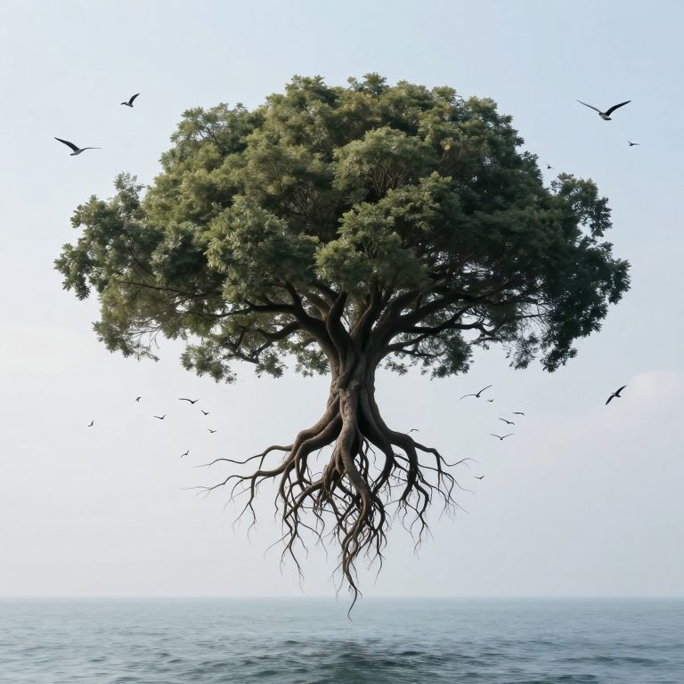 Photorealistic image of a floating tree with green foliage and exposed roots, surrounded by flying birds, over a calm blue ocean.