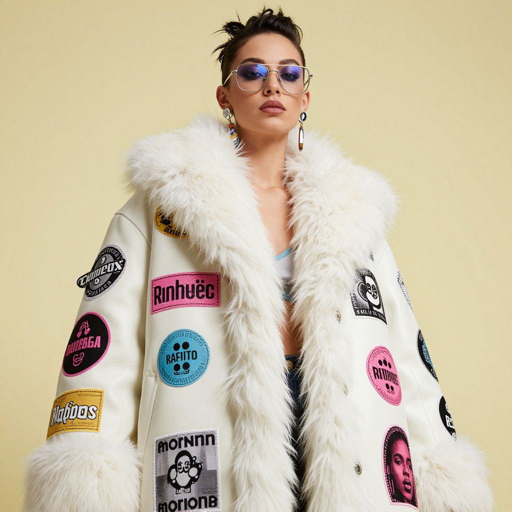 Photograph of a confident woman with short, spiky black hair and blue-tinted sunglasses. She wears a luxurious, white fur coat adorned with colorful graphic patches, including pink, blue, black, and yellow designs. Her outfit is complemented by large, dangling earrings. The background is a simple, solid light beige color, putting focus on her stylish attire. The fur coat has a fluffy texture, contrasting with the smooth patches, creating a bold, modern fashion statement. The overall style is edgy and contemporary.