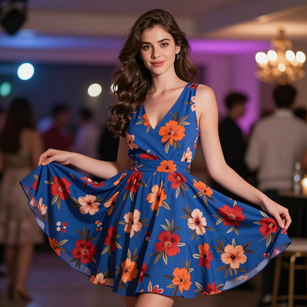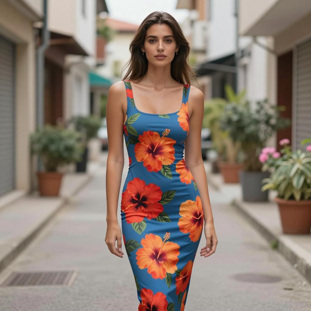 A young woman with long, wavy brown hair wearing a blue floral dress with red and orange flowers stands confidently on a sunny street in front of a tan building. She has a slight smile, wears ornate gold earrings, and poses casually with one hand on her hip. The scene is brightly lit with natural daylight, evoking a warm summer atmosphere, with the fabric details of the dress clearly visible.