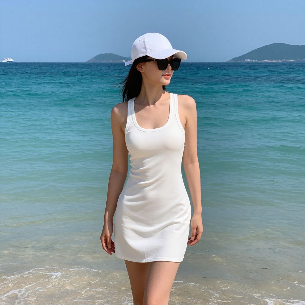 Woman enjoying a sunny beach day wearing a stylish white sundress by Zoe Alexander, complemented by a matching white cap and sunglasses, with turquoise waters and distant mountains in the background.