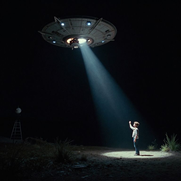 Dorothea Lange a beam of light from an alien spacecraft shone onto a teenage boy. Night time. Science fiction. Cinematic. long shot. Wide angle.,