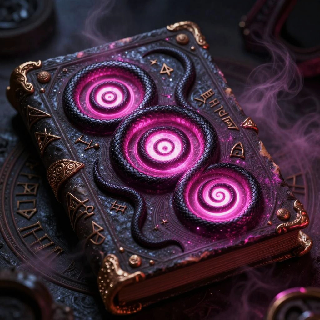 Slaanesh symbols rendered as glowing hypnotic spirals and serpentine shapes in vivid magenta and black, embedded in an ancient tome or artifact, surrounded by mystical runes and swirling mist, invoking dark sorcery and forbidden power.