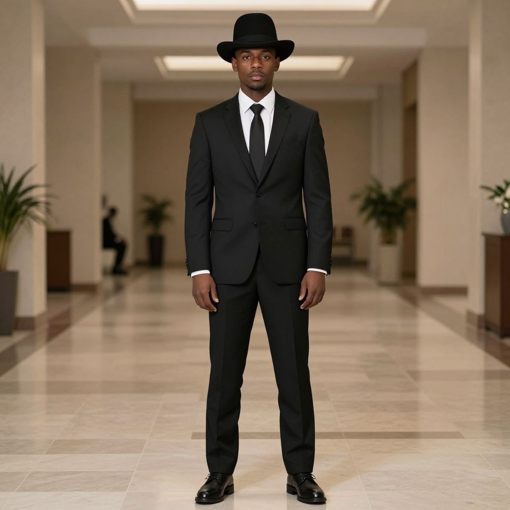 Photograph of a tall, dark-skinned Black man standing in a brightly lit, modern hallway with polished cream-colored tiles. He wears a black suit, white dress shirt, black tie, and black bowler hat. His black dress shoes are shiny. His expression is serious and neutral. The background features potted plants on either side and a blurred figure sitting in the distance. The ceiling has recessed lighting panels. The overall style is formal and elegant, with a focus on contrast between the dark suit and the bright hallway.