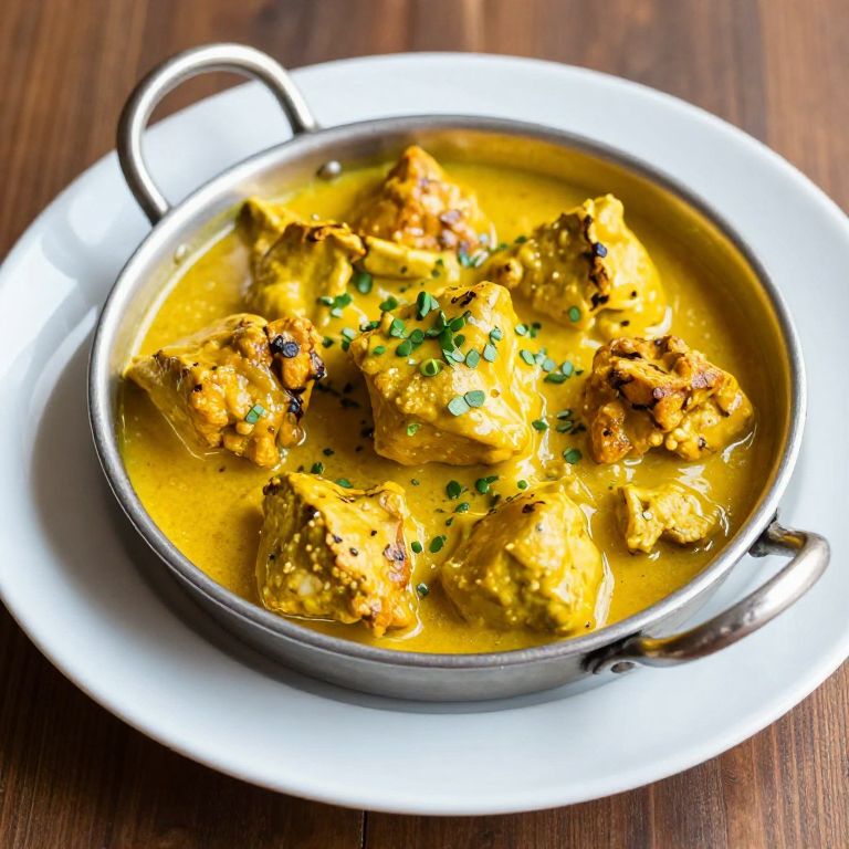 Photograph of a silver saucepan filled with golden-yellow curry containing large, tender chicken pieces with visible browned edges, garnished with chopped green herbs. The curry has a rich, creamy texture and is served on a white ceramic plate. The saucepan has two small, curved handles on opposite sides. The background features a dark wooden table, adding warmth to the image. The lighting highlights the vibrant color of the curry and the texture of the chicken.