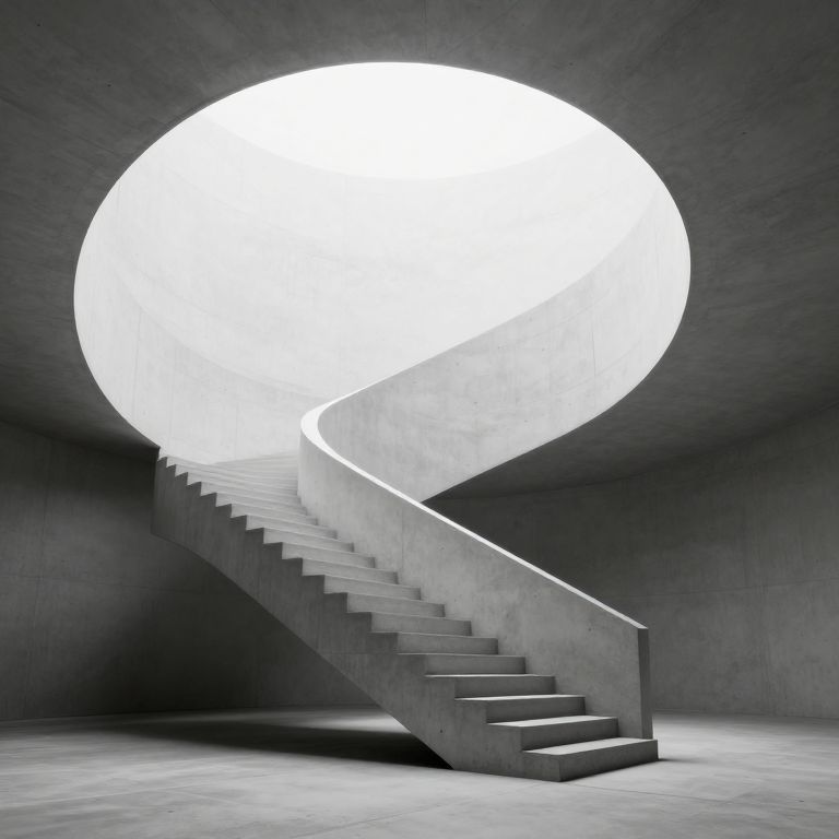 A minimalist concrete staircase ascends seamlessly into a luminous circular void, defying gravity and perspective as it vanishes into an ethereal, weightless realm.