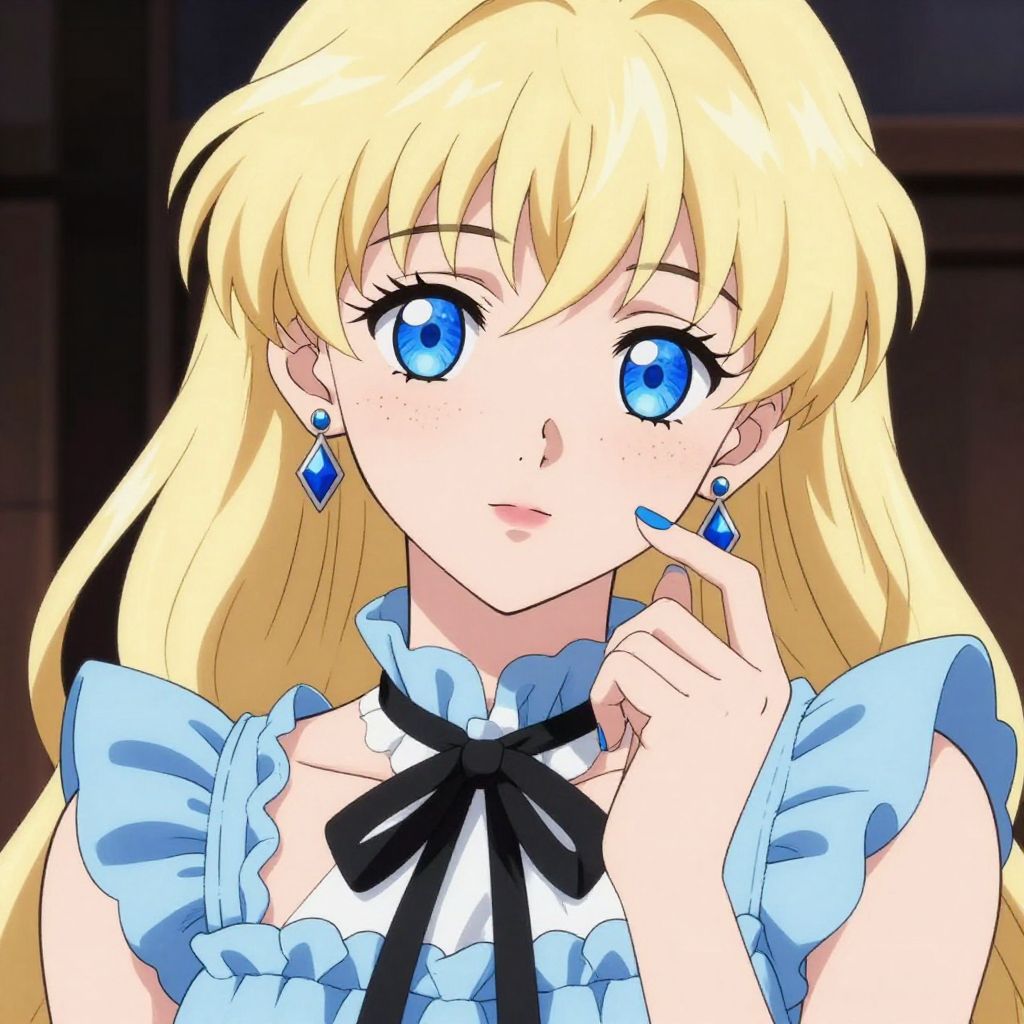 Close-up of an anime-style blonde girl with striking blue eyes, wearing a light blue ruffled dress adorned with a black ribbon. She has delicate freckles on her face and is accessorized with blue diamond-shaped earrings and matching nail art, against a dark background.