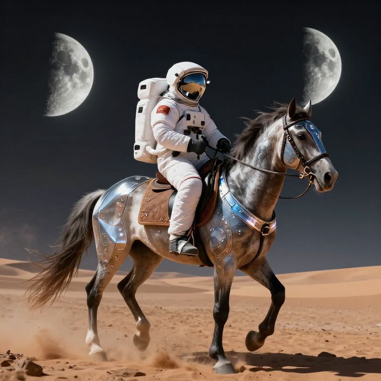 Astronaut riding a horse across a desert planet under twin moons, the horse adorned with glowing futuristic armor, astronaut's suit reflecting the alien sky, dramatic lighting, hyper-realistic textures, a fusion of space exploration and classic horseback adventure.