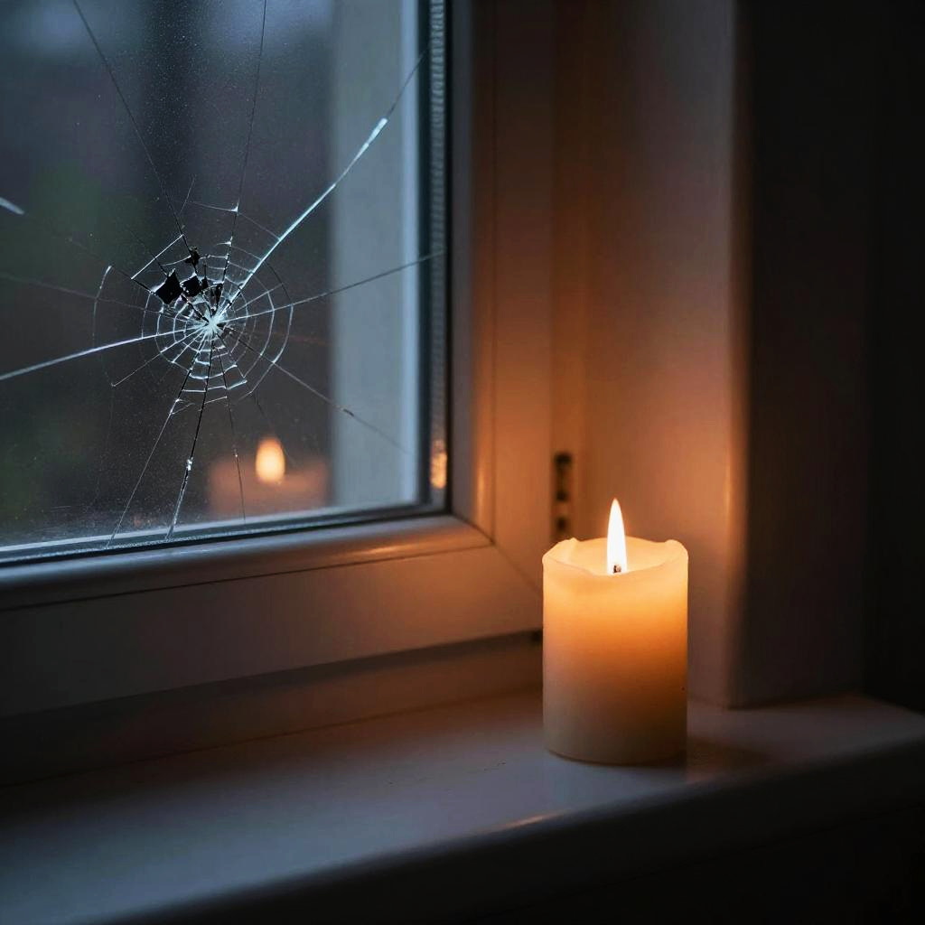 Candle in dark room flickering beside a cracked window, cold breeze causing tiny sparks, muted colors, textured shadows, feeling of solitude and contemplation