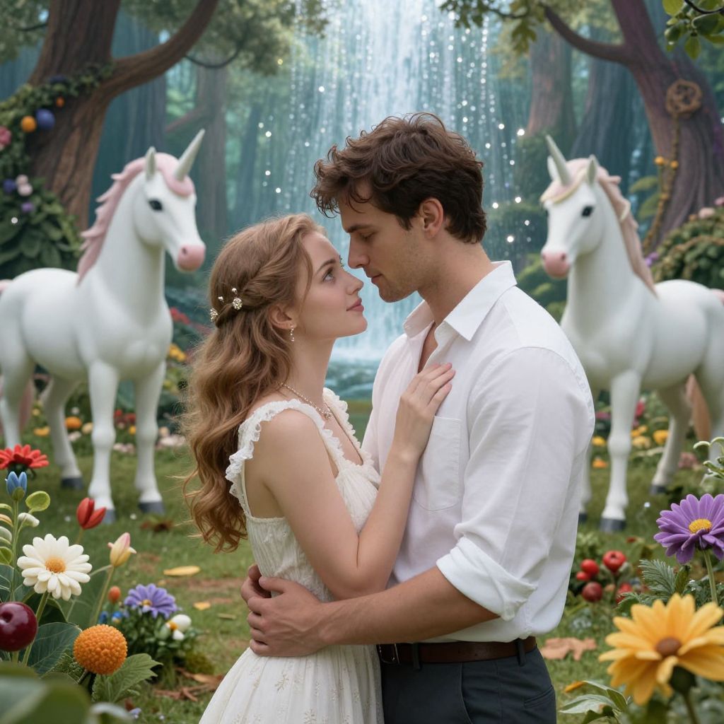 Photograph of a romantic forest scene featuring a young couple in an embrace. The woman, with wavy blonde hair adorned with small white flowers, wears a white, lace-trimmed dress, while the man, with short brown hair, dons a white, partially unbuttoned shirt with rolled-up sleeves. They gaze into each other's eyes with tender expressions. Behind them, two white unicorns stand amidst a lush, colorful garden filled with vibrant flowers and surrounded by tall trees. Sparkling fairy lights cascade from above, creating a magical atmosphere. The man's hand rests gently on the woman's waist, and she places her hand on his chest.