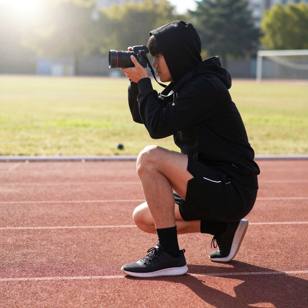 Photograph of a person in a black athletic outfit, including a hoodie and shorts, squatting on a sunlit red track. The person is holding a camera up to their face, capturing a photo. Bright sunlight flares in the background, with a blurred grassy field and trees visible. Shadows from the track lines are cast on the ground. The person is wearing black socks and sneakers.